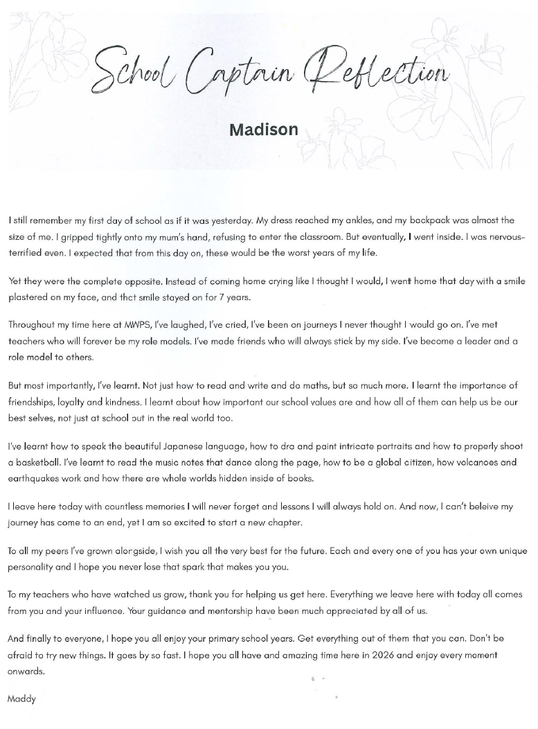 We are delighted to share their final speeches with the MWPS community. Their words captured the pride, gratitude, and wisdom they've gained throughout the year, offering a thoughtful close to their chapters, and an inspiring beginning for the leaders who will follow.