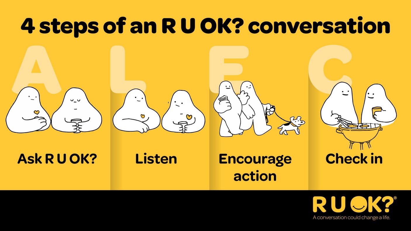 Thursday 11 September is R U OK?Day but we know that whether it’s a friend, family member, partner, or colleague , the people around us go through life’s ups and downs every day. That’s why we want everyone to feel confident to check in with the people they care about and Ask R U OK? Any Day." ~ RU OK Official Website