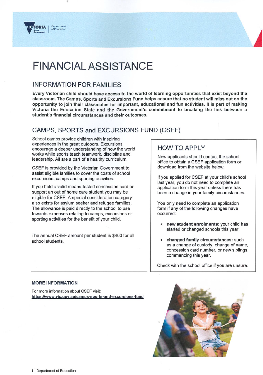 The Department of Education administers the CSEF to help eligible families with the costs of camps, sporting activities, excursions and incursions. For more information, please visit Camps, Sports and Excursions Fund (CSEF)