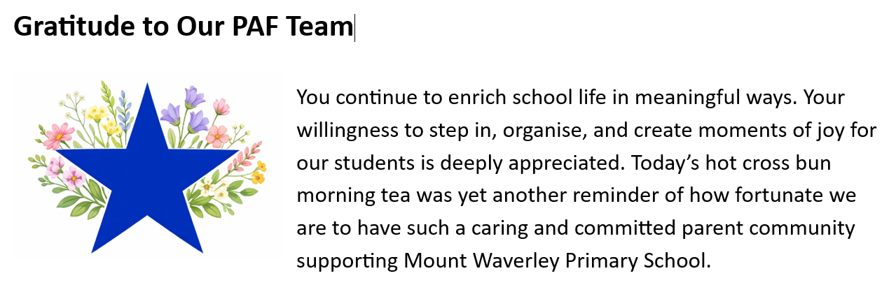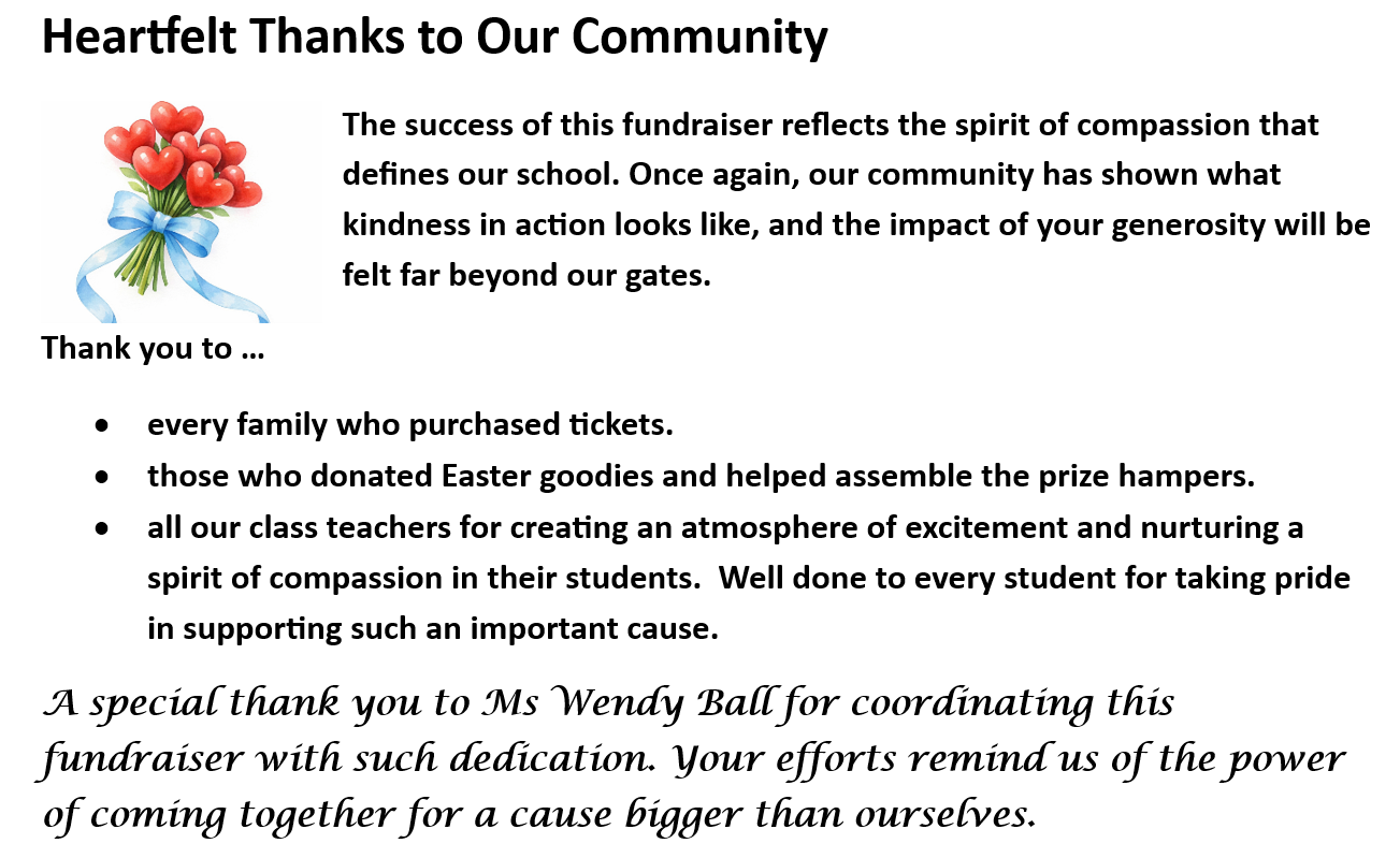 I would like to sincerely thank our families and community members for the enthusiasm and support you have shown across the term. Your involvement plays a vital role in enriching the experiences we provide for our students. I also extend my appreciation to our staff, whose ongoing dedication ensures the delivery of a vibrant, engaging curriculum with student wellbeing at its core.