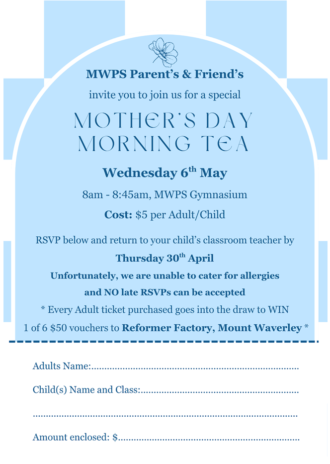 Industrial Action ~ My thanks to the families of MWPS for their overwhelming support for staff during last Tuesday’s stop work. Should there be any further action, the school will communicate as early as possible.