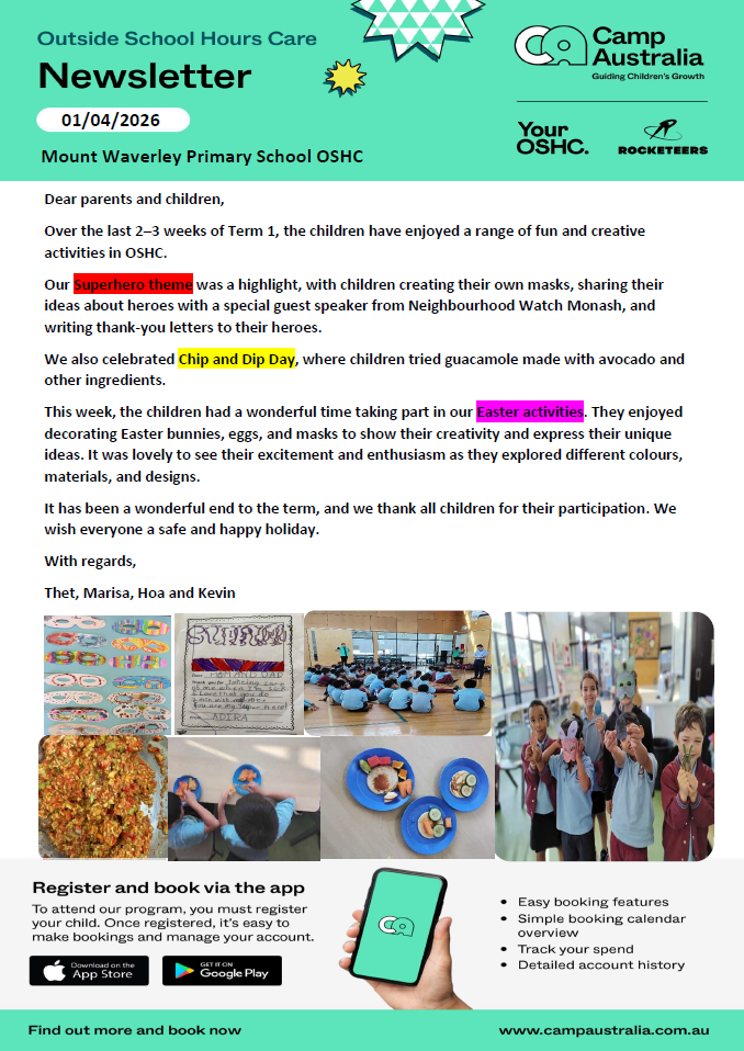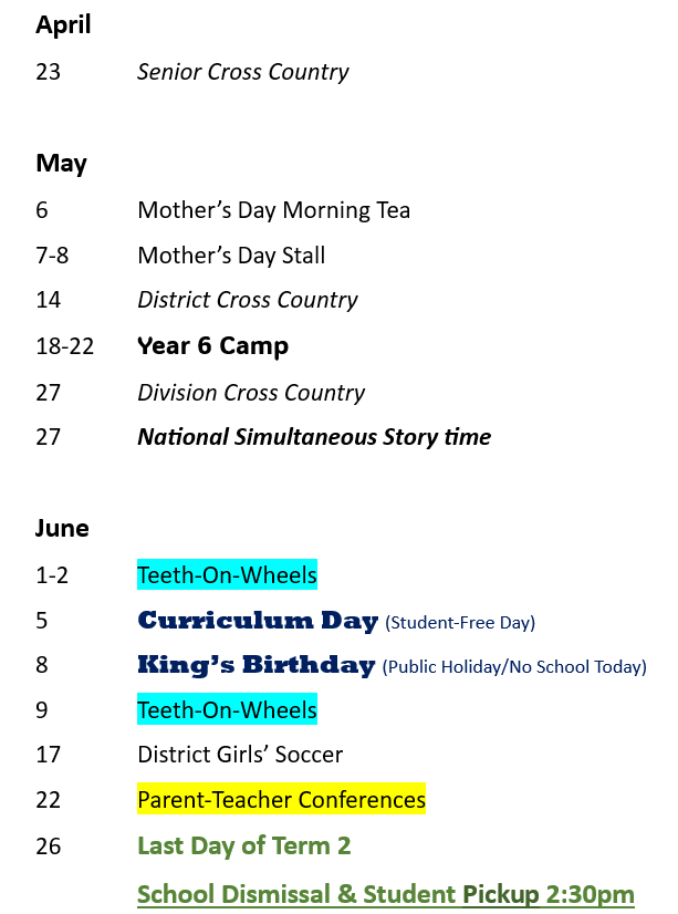 End of Term ~ Today is the last day of Term 1. Students will be dismissed at 2:30pm. If parents require supervision for their children, Camp Australia will be offering the Out of School Hours Care program from 2:30pm.