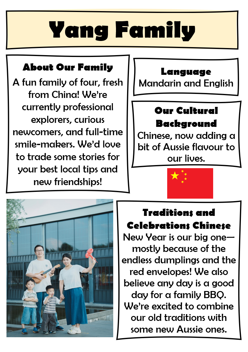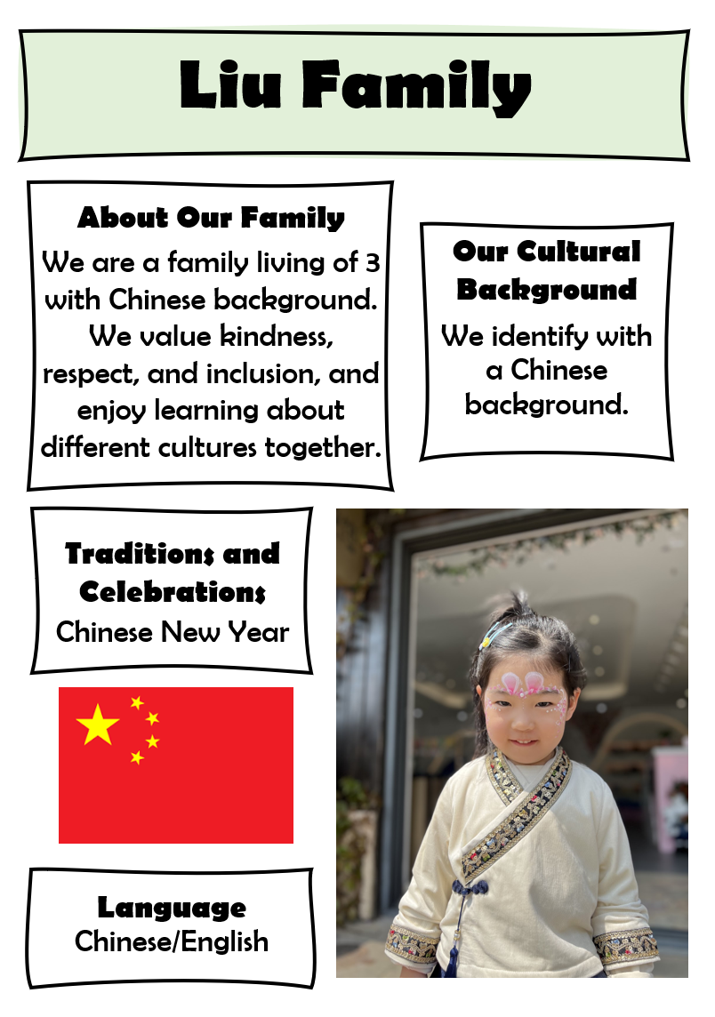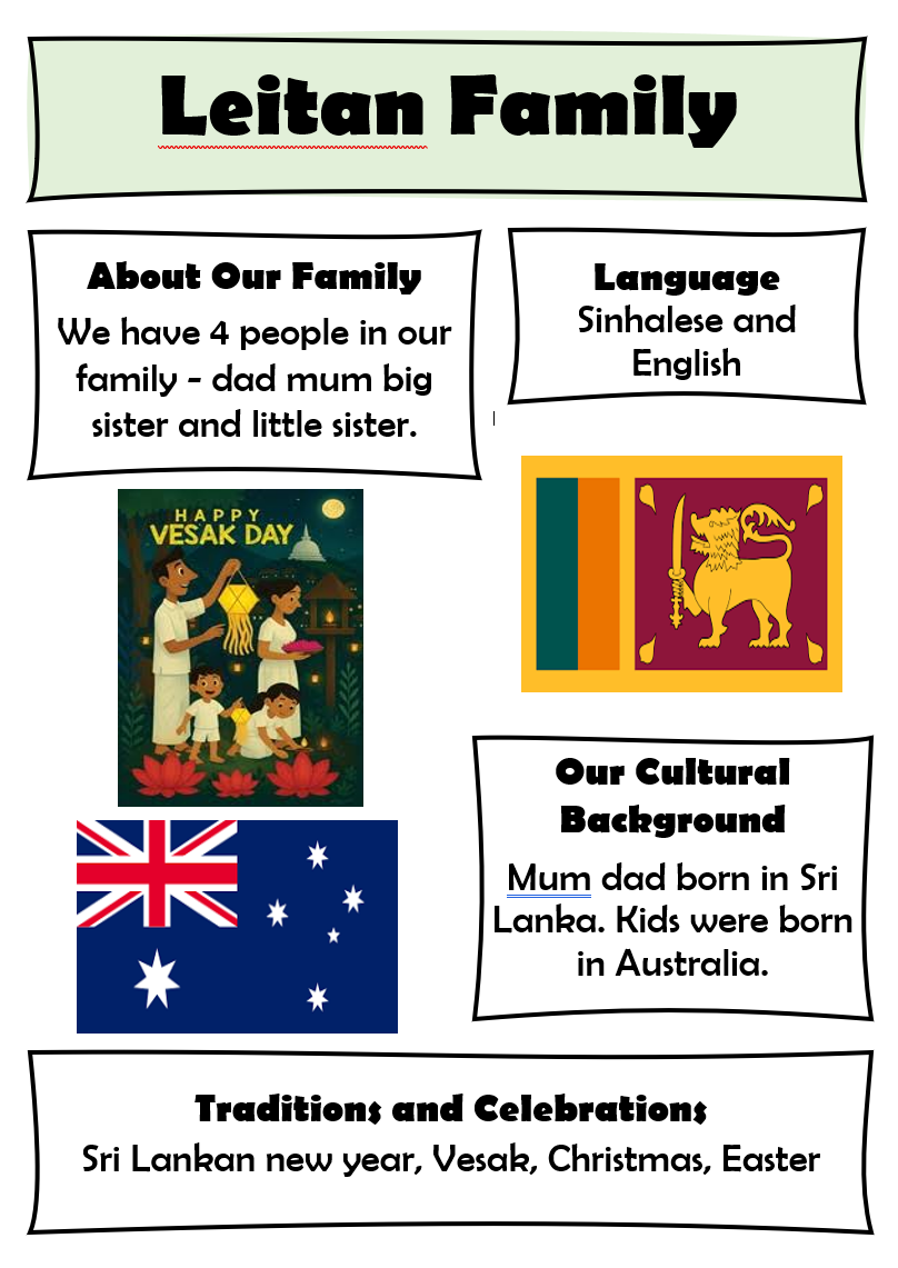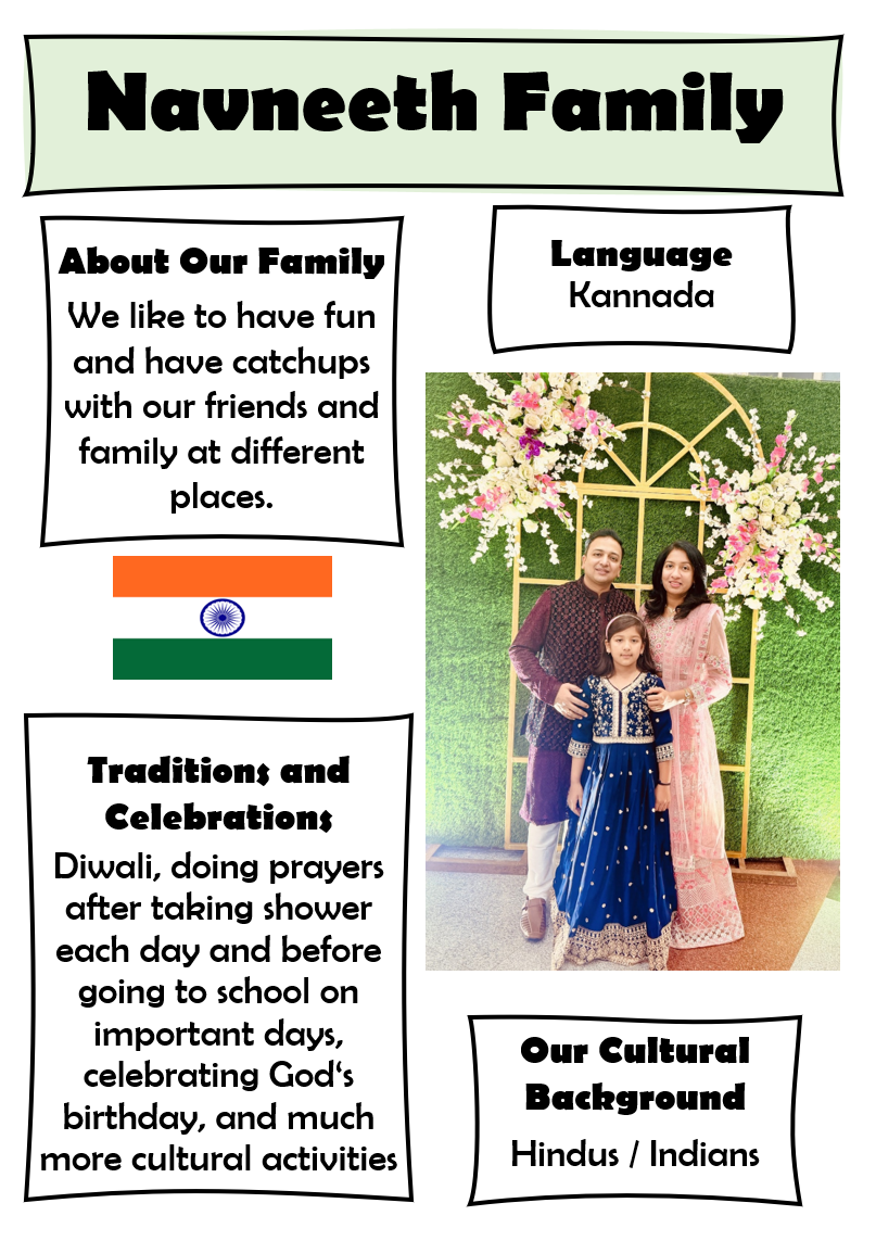 This week, we are proud to showcase the Leitan, Kwon, Agarwal, Yang, Liu and Navneeth families who have generously shared their stories, traditions, and experiences with our school community.