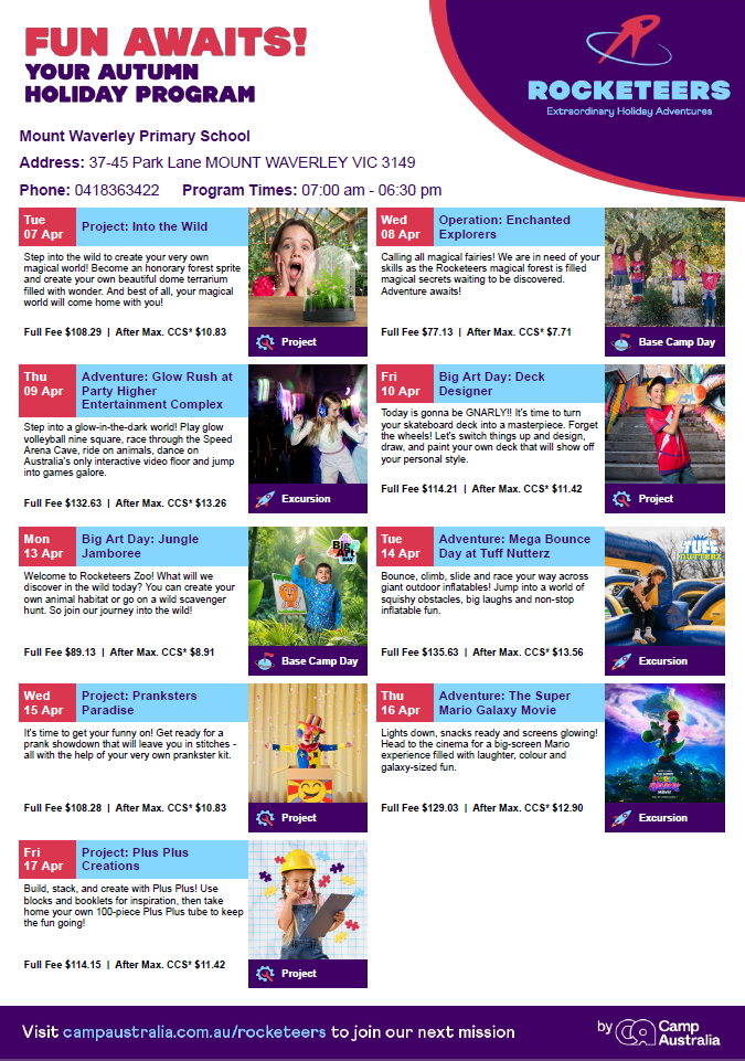 Mount Waverley Primary School’s grounds are supervised by school staff from 8:45 am until 3:45 pm. Outside of these hours, school staff will not be available to supervise students. Parents and Carers are responsible for the safety of students outside of these hours.