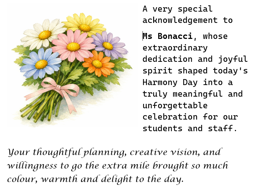 Throughout the day, students engaged in a range of classroom activities that focused on diversity, inclusion and respect, helping to deepen their understanding of what Harmony Day represents.